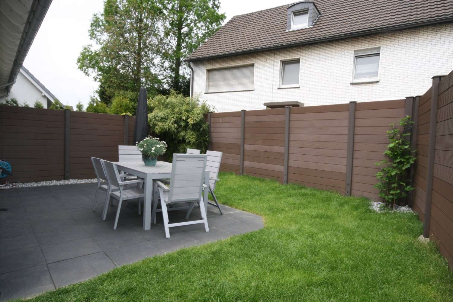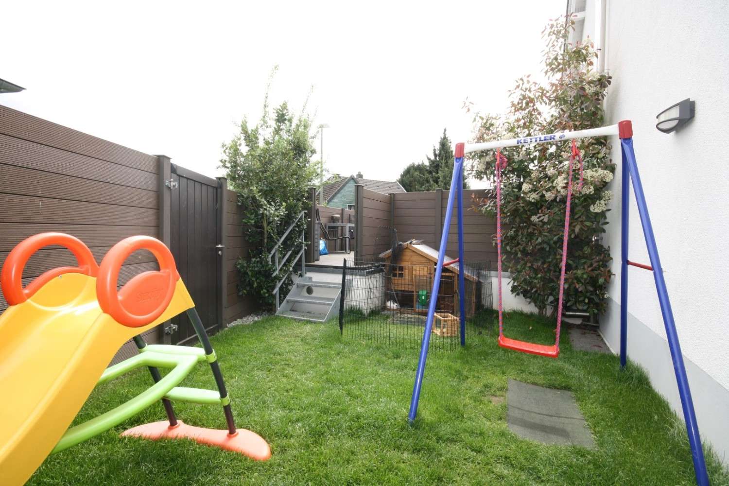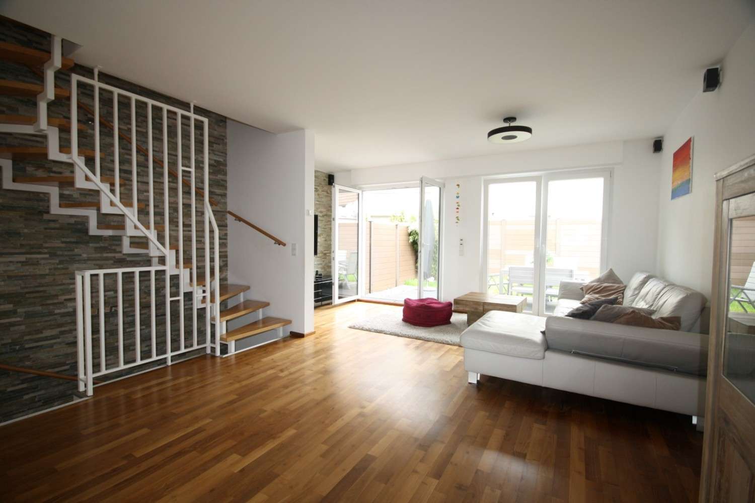 Der Wohn-/Essbereich mit offener Küche nimmt eine komplette Ebene ein und ist mit 45 qm großzügig ausgelegt. Von hier erreichen Sie den kleinen, pflegeleichten Garten.